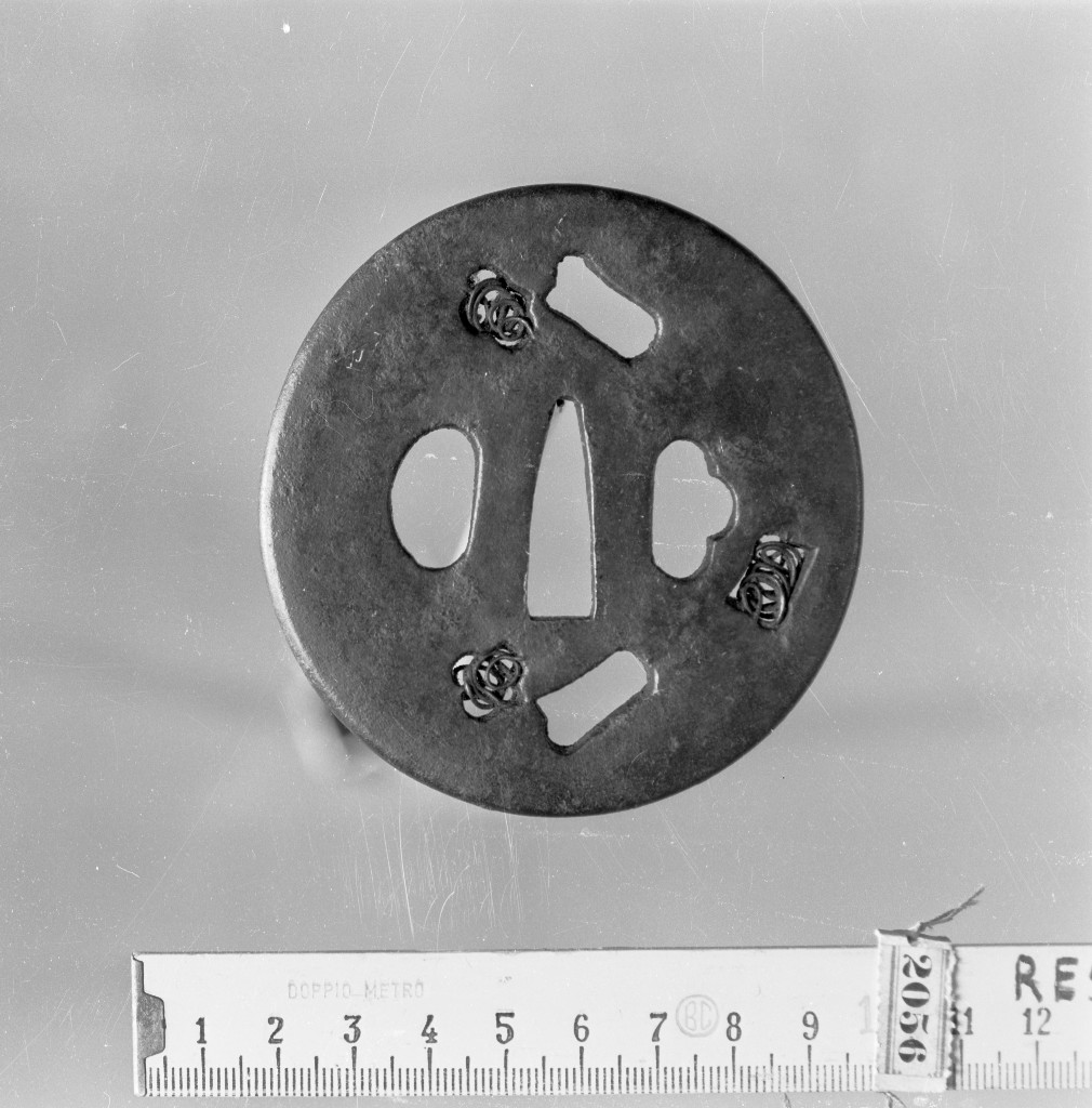 TSUBA CON RYO-HITSU. LAVORAZIONE IN KO-SUKASHI, RANMA-SUKASHI. TRACCE DI KUN-NUNOME-ZOGAN. MOTIVI A SPIRALE, TRACCE DI DISEGNI GEOMETRICI