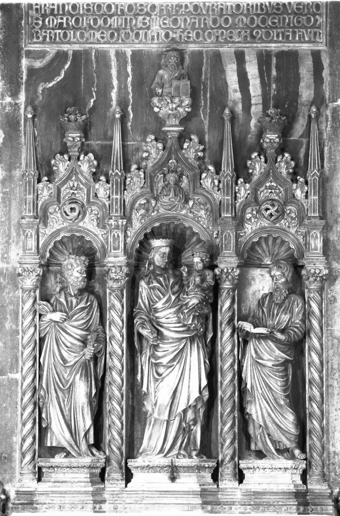 In una stupenda cornice gotica sono ricavate tre nicchie con volta a conchiglia nelle quali sono inseriti S. Marco, la Vergine e S. Giovanni Ev.. Sopra la Madonna è posto un Angelo a mezzo busto che introduce l'idea dell'Annunciazione, tema caro a Venezia, e ancora più in alto campeggia la mezza figura di Dio Padre