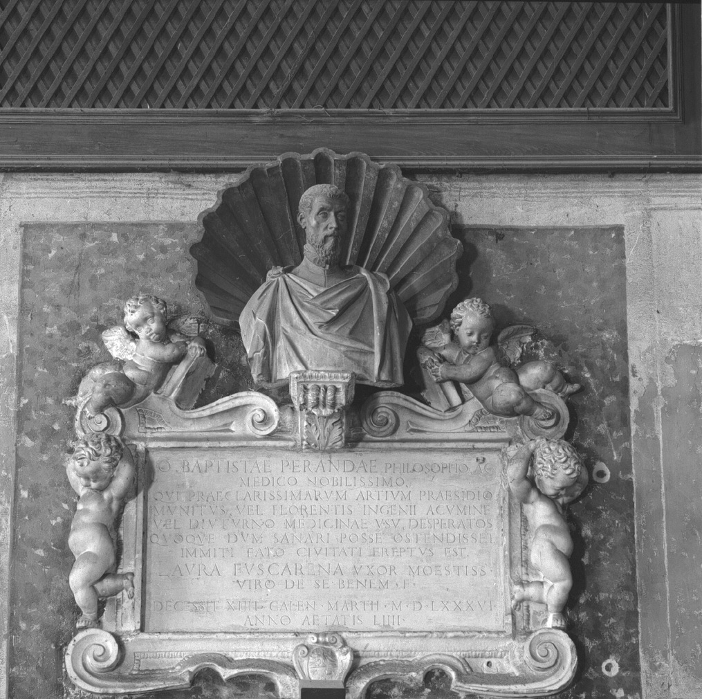 Lapide ornata da due putti a rilievo sui lati corti e da altri due sugli angoli superiori; in alto, al centro, il busto del Peranda; in basso lo stemma della famiglia
