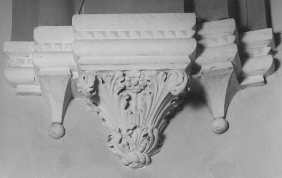 Capitello con foglie d'acanto, affiancato da due elementi simili a pe- ducci