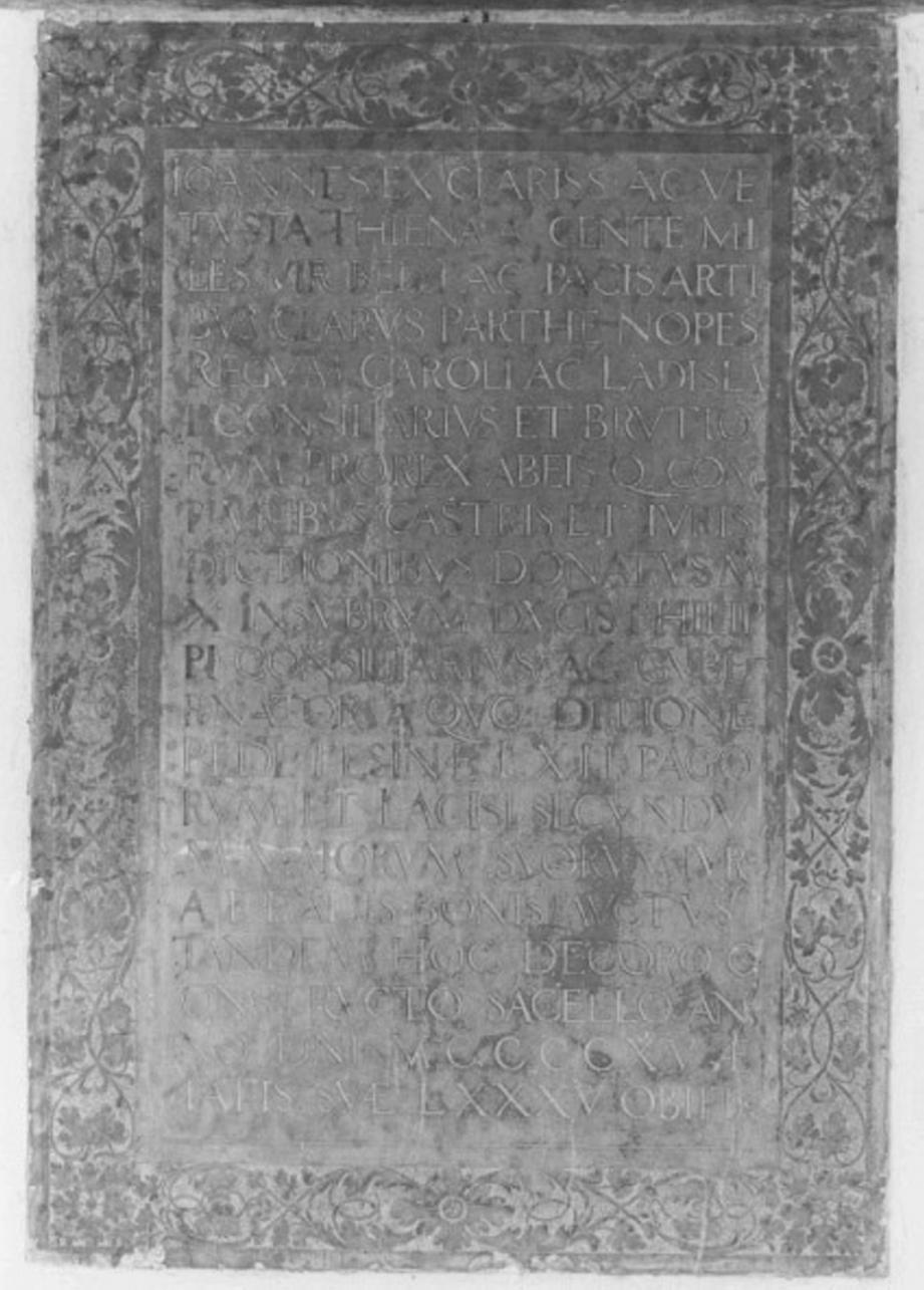 - ISCRIZIONI Sotto l'arca tra i modiglioni - IOANNES EX CLARISS. AC VE/TUSTA THIENAEA GENTE MI/LES VIR BELLI (...) -