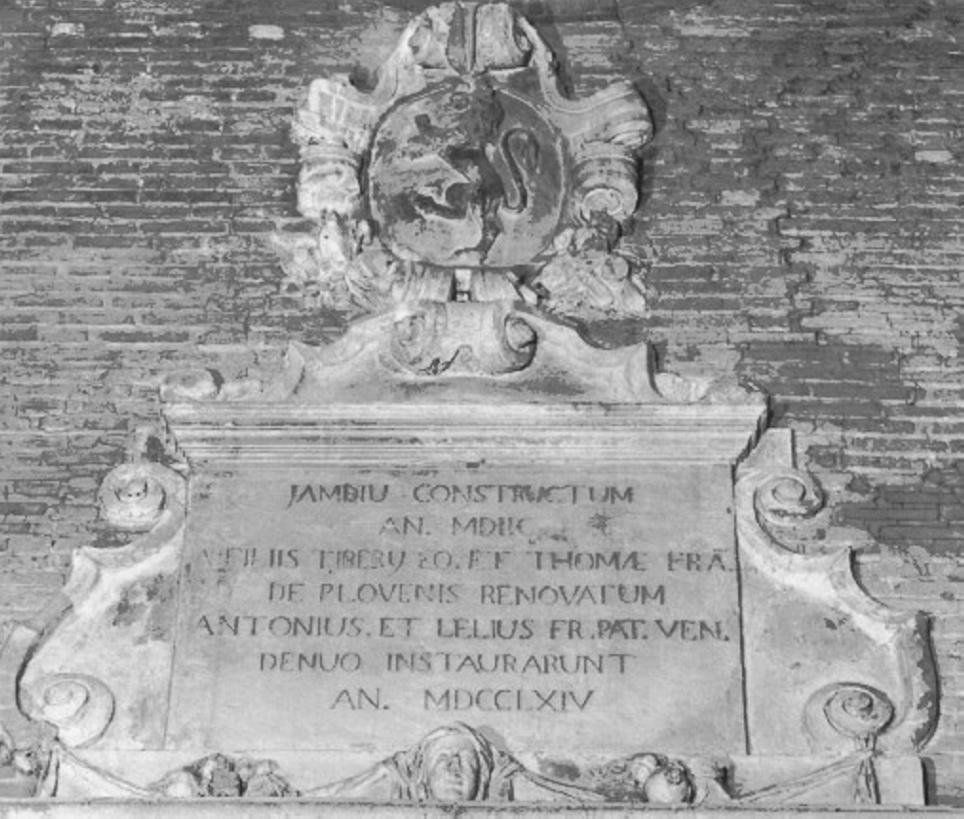 - ISCRIZIONI Fastigio - JAMDIUM CONSTRUCTUM AN. MDIIC A FILIIS TIBERY EQ. ET THOMAE FRA. DE PLOVENIS. RENOVATOM[...] - lettere capitali -