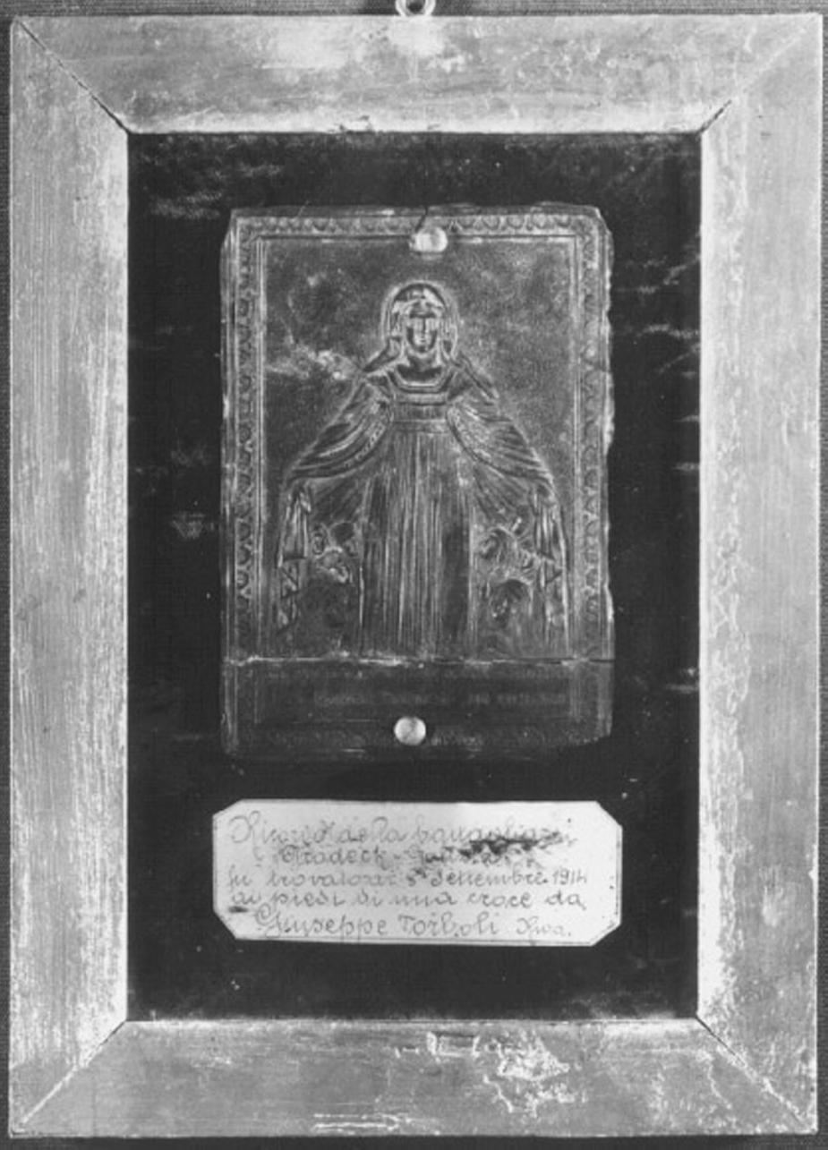 - ISCRIZIONI retro - QUESTA IMMAGINE VERA EFFIGE/ DELLA BEATA VERGINE DEL MONTE BERICO DI VICENZA/ FU TROVATA DA TORBOLI GIUSEPPE/ ASSIEME A ARNALDI GIUSEPPE DI/ RIVA IL GIORNO 8 SETTEMBRE/ 1914 VERSO MEZZODI' MENTRE/ FERVEVA LA SANGUINOSA BAT/ TAGLIA DI GRADEK IN GALIZIA./ FU TROVATA AI PIEDI DI UNA/ CROCE MENTRE ERANO ASISI/ A RIPOSARE./ ESSI FECCERO LA PROME(SS)A CHE SE LA BEATA VERGINE LI/ SALVA DA QUESTA TERRIBILE GUER/ RA SI PORTERANNO IN PELLEGRI/ NAGGIO AL SUO SANTUARIO/ A RINGRAZIARLA PERSONALMENTE/ DELLA GRAZIA RICEVUTA./ RIVA APRILE 1915 G.TORBOLI - Torboli G - corsivo - a penna - italiano volgare