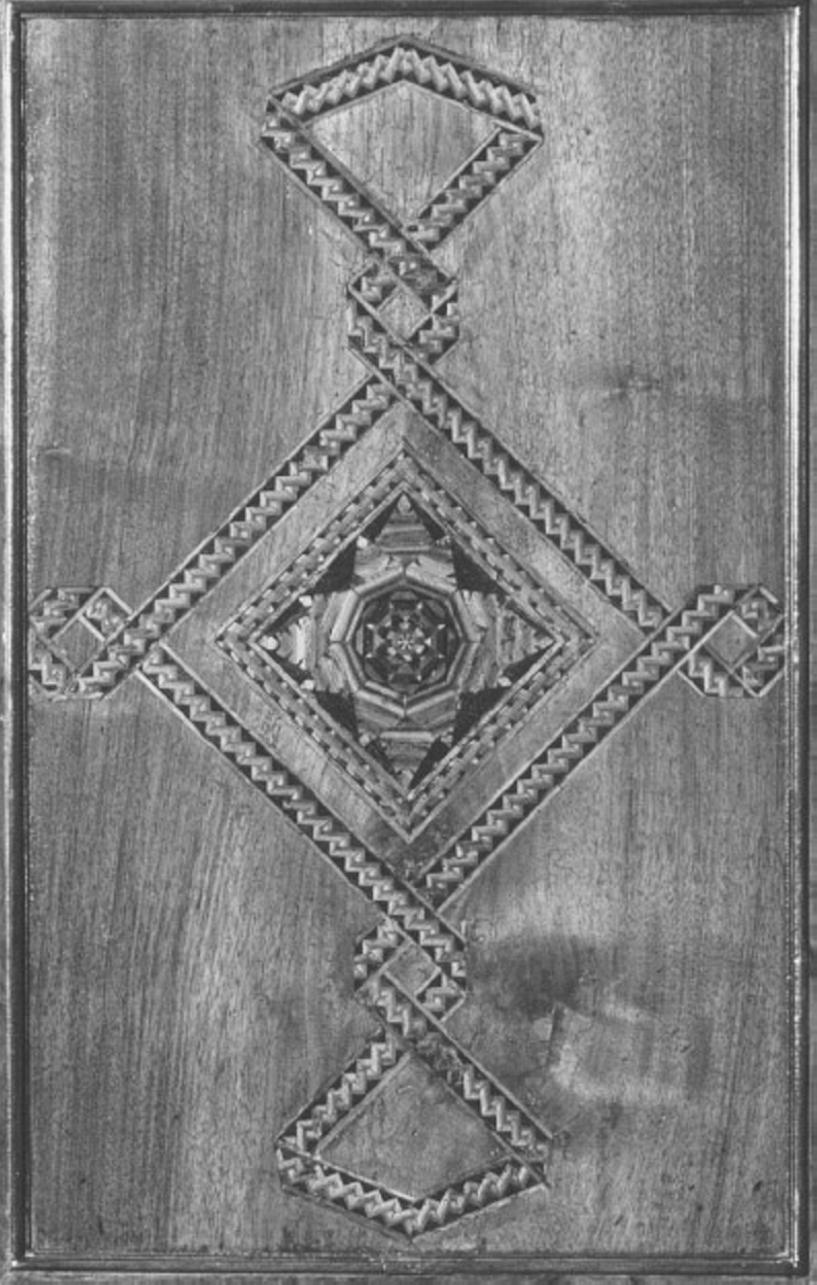 Decorazioni: treccia segmentata; nastro spiraliforme attorno a un bastoncino; fiorone a dodici petali frastagliati