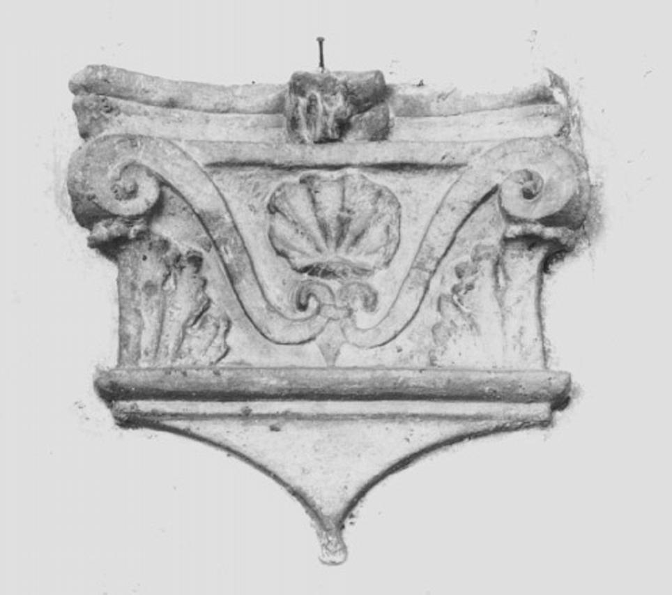 Peduccio con oliva, foglie d'acanto, caulicoli, conchiglia e rosetta