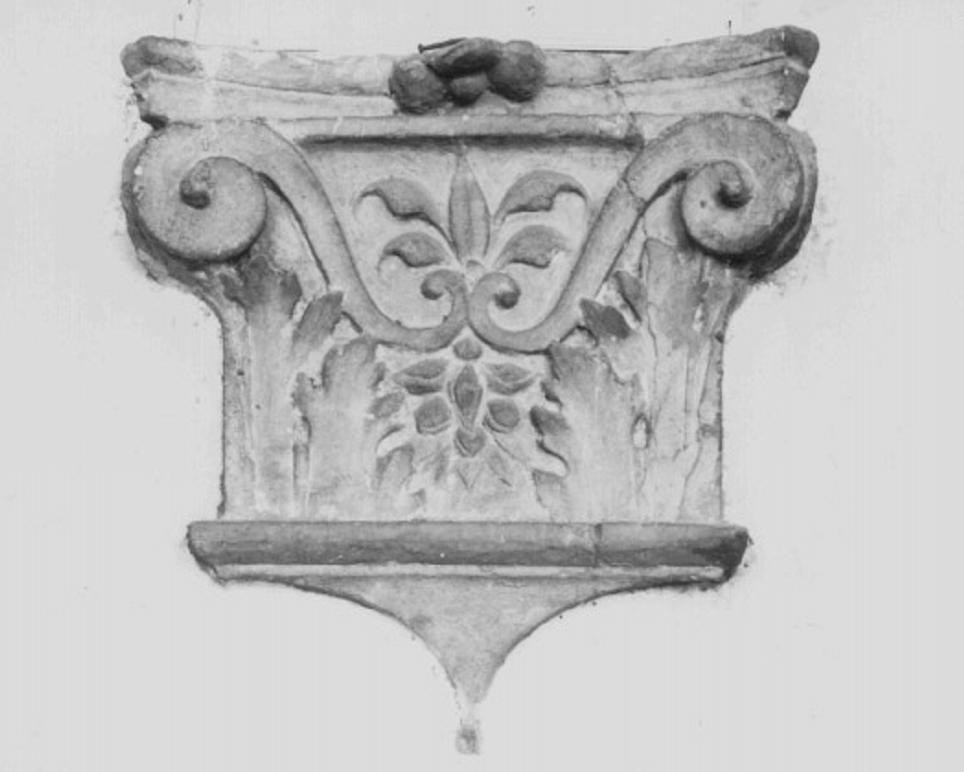 Peduccio con oliva; foglie d'acanto; caulicoli; motivi fitomorfici; rosetta
