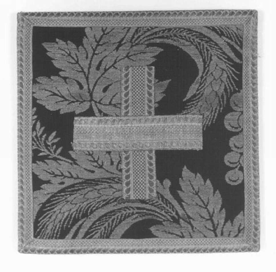 Tessuto: fondo nero, motivi ottenuti per trame broccate in oro filato e argento lamellare. Gallone: a telaio in oro filato e seta gialla