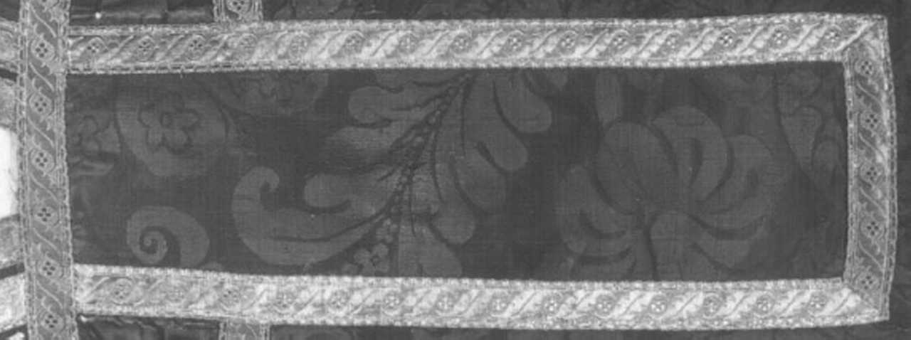 Tessuto: Monocromo rosso, fondo raso faccia catena, disegno raso faccia trama. Fodera: tela di canapa grigio - azzurra. Decorazione: motivi ad asse centrale con elementi vegetali a volute