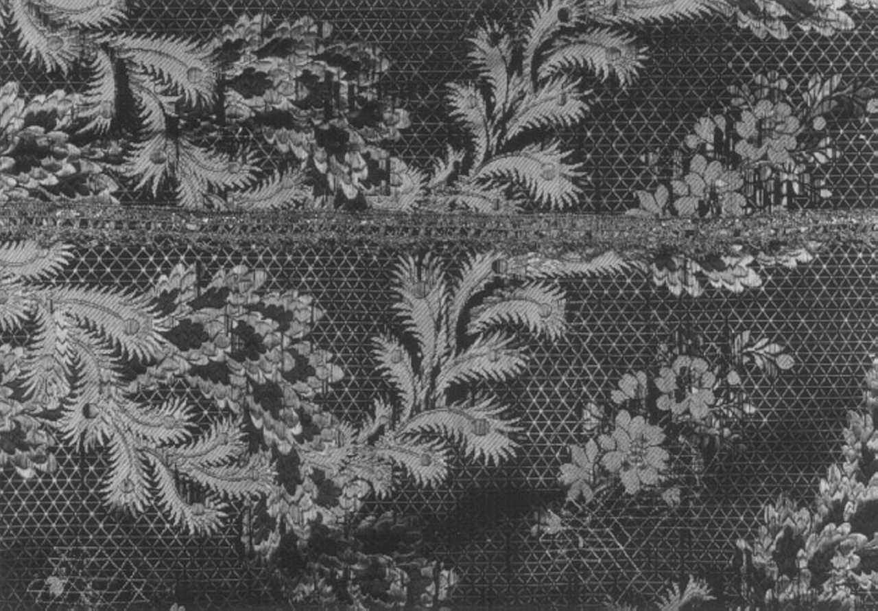 Tessuto: fondo prugna con motivi ottenuti per trame lanciate bianche e trame broccate in sete policrome e seta ondata avorio. Decorazione: motivo a meandri, con piume e tralci fioriti