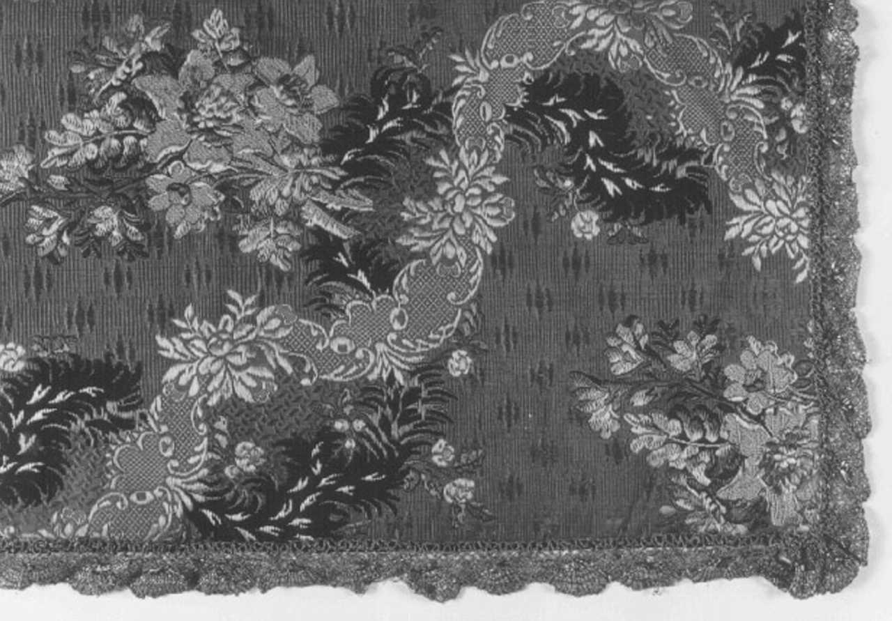 Tessuto: fondo rosso bordeaux chiaro, con effetti di controfondo; motivi ottenuti per trame lanciate in seta bianca e trame broccate in sete policrome, seta ondata avorio e ciniglia bordeaux. Decorazione: motivo a meandri con nastri e tralci fioriti