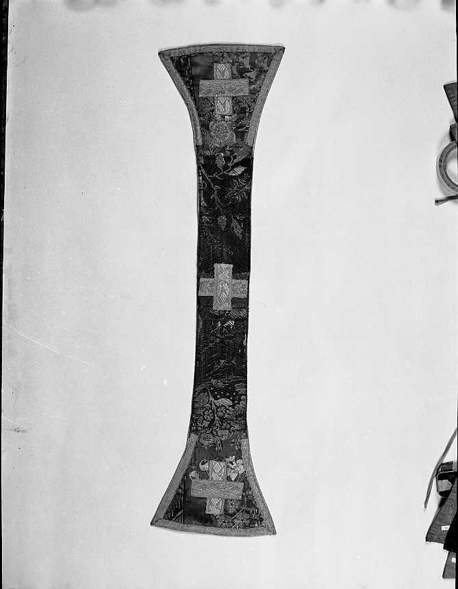 Manipolo tessuto fondo raso verde, motivi ottenuti per trame lanciate in sete policrome. Fodera in tela gialla. Gallone a telaio in seta gialla. Decorazione con motivo bizarre