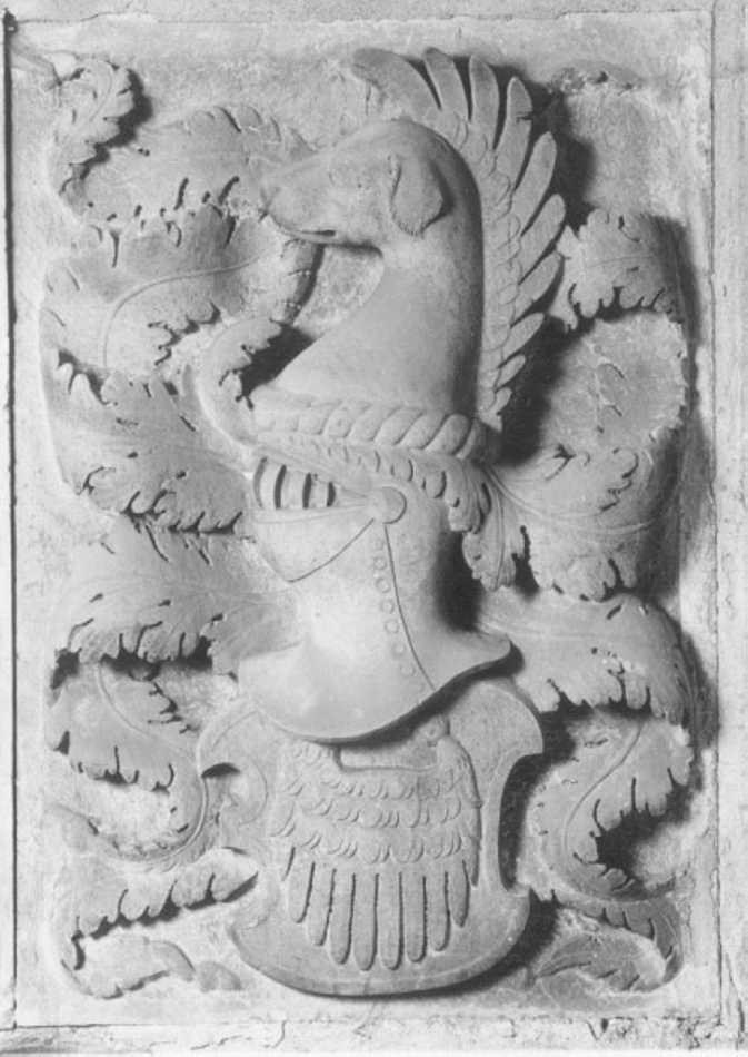 - STEMMI A sinistra della lapide - gentilizio - Stemma - Al mezzo volo abbassato sormontato da elemo graticolato cimiero con testa di cane, lercine e lambrecchini