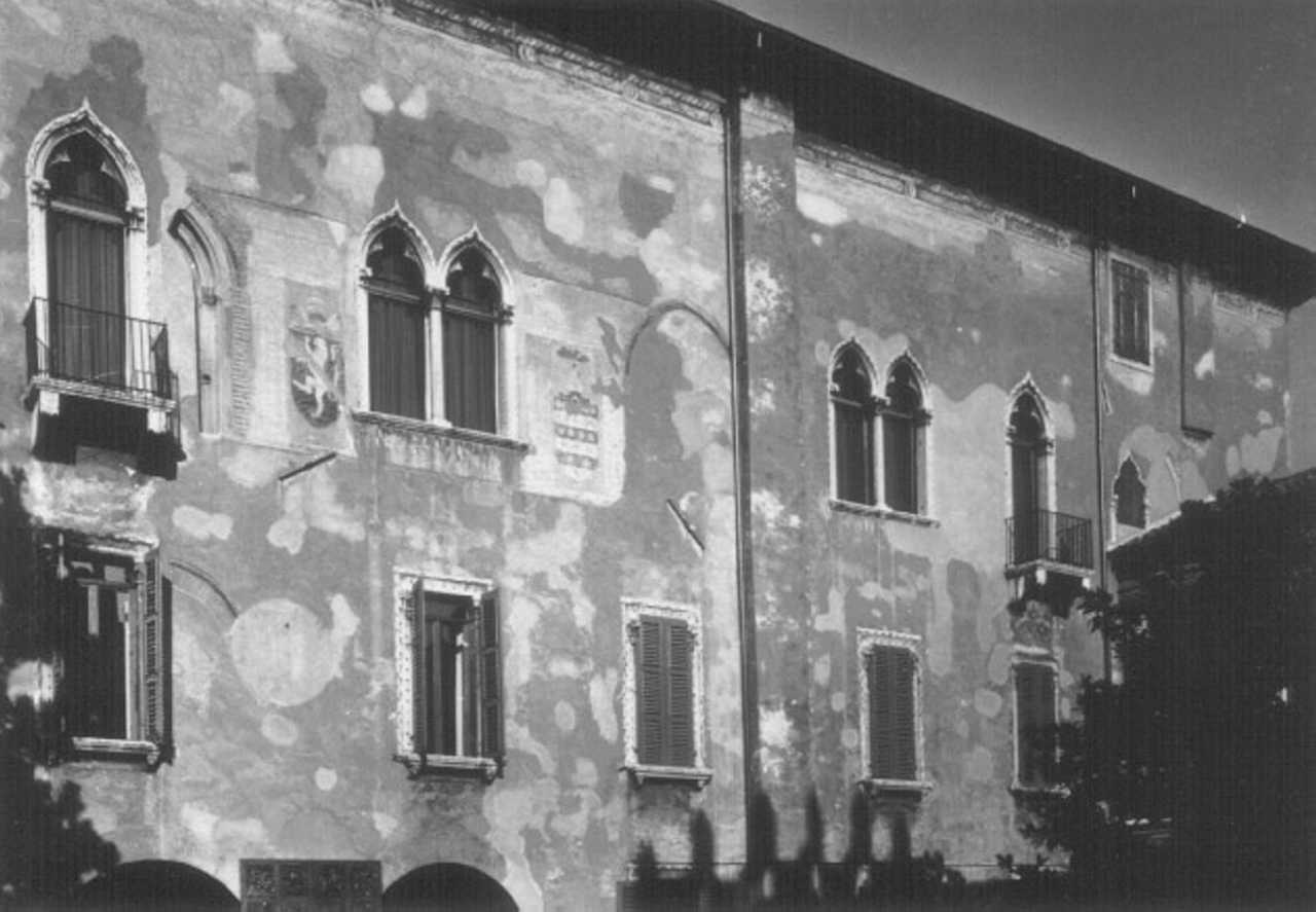 - NOTIZIE STORICO CRITICHE Si e' sempre ritenuto che gli affreschi siano stati commissio- nati dal Michiel, per la presenza del suo stemma. Lo stemma di Paolo II, morto molto prima del 1477, potrebbe essere un tardivo omaggio del cardinale allo zio che l'aveva assegna- to nel '71 alla sede veronese. Gli affreschi comunque (cfr. lesena a destra dello stemma papale), vennero manomessi gia' dallo stesso Michiel per la costruzione delle finestre
