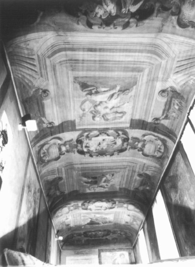 Scene mitologiche/ Parche/ motivi architettonici a trompe l'oeil/ festoni/ cartigli/ mascheroni