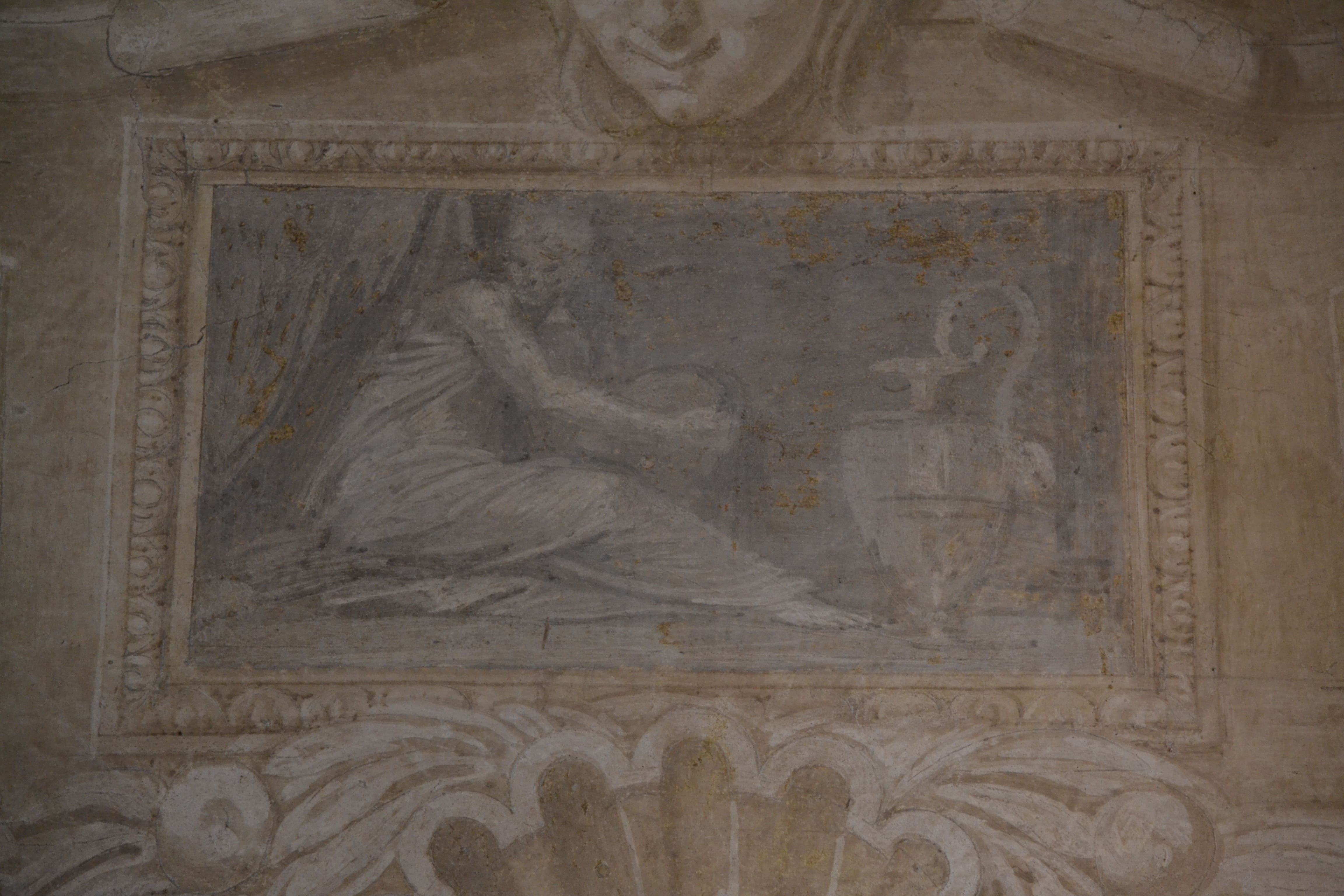 Scomparto rettangolare decorato a monocromo con figura femminile vestita all’antica e seduta sul lato sinistro del riquadro. La giovane tiene in mano un recipiente e rivolge lo sguardo verso l’osservatore. Sulla destra è raffigurata una grande anfora
