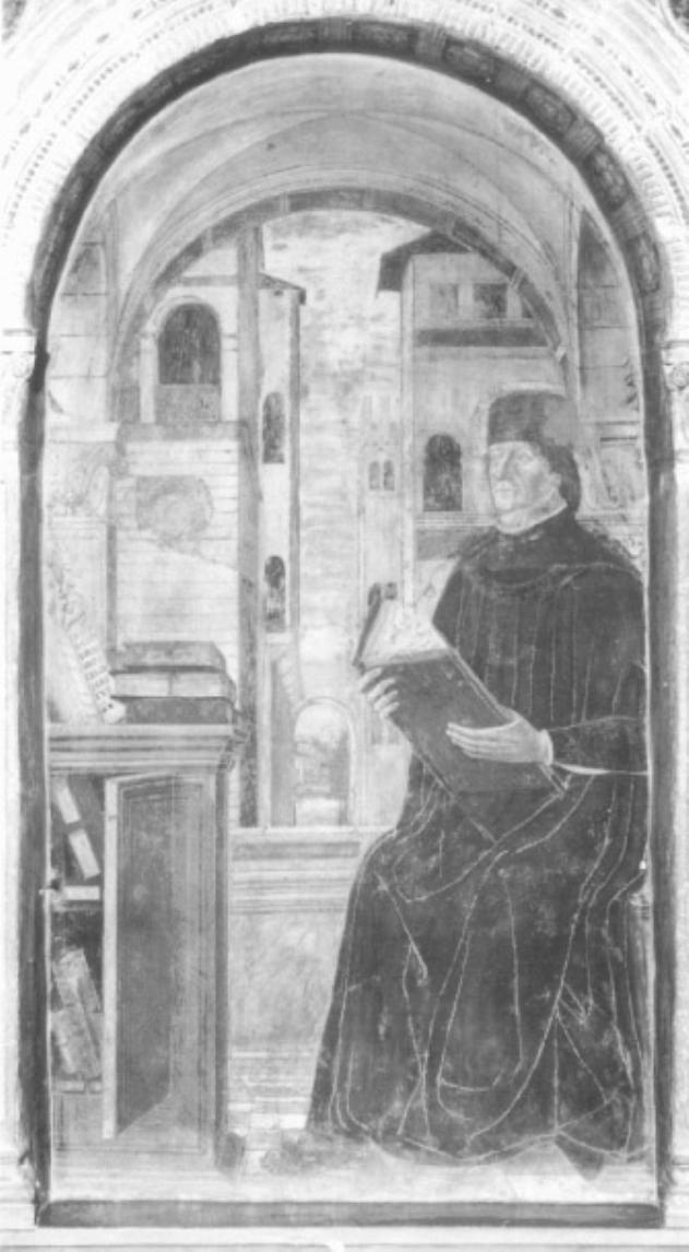 Figure: studioso. Oggetti: scrivania; libri. Costruzioni: palazzi. Elementi architettonici: arco. Paesaggi