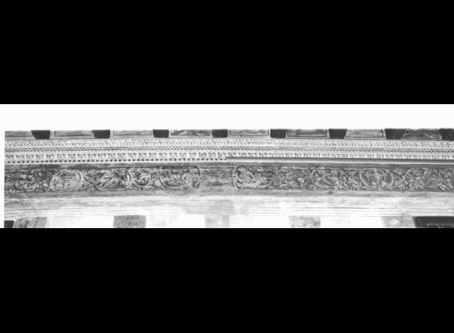 motivo decorativo con vasi, tralci, cartigli e fauni/ Scena biblica
