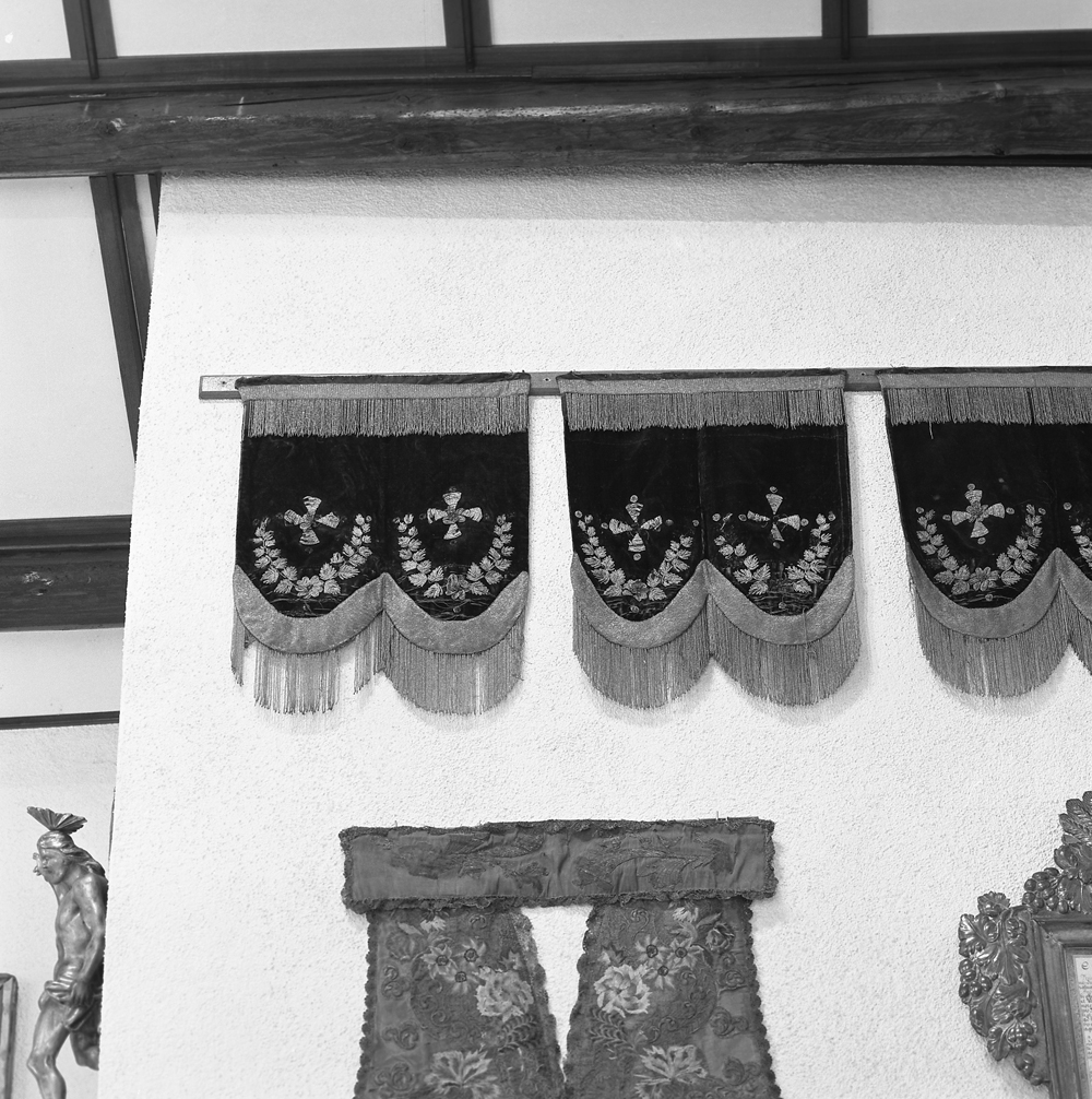 Festone in velluto cremisi ricamato in conterie giallo-oro con motivi floreali e lunghe frange; al centro una croce greca