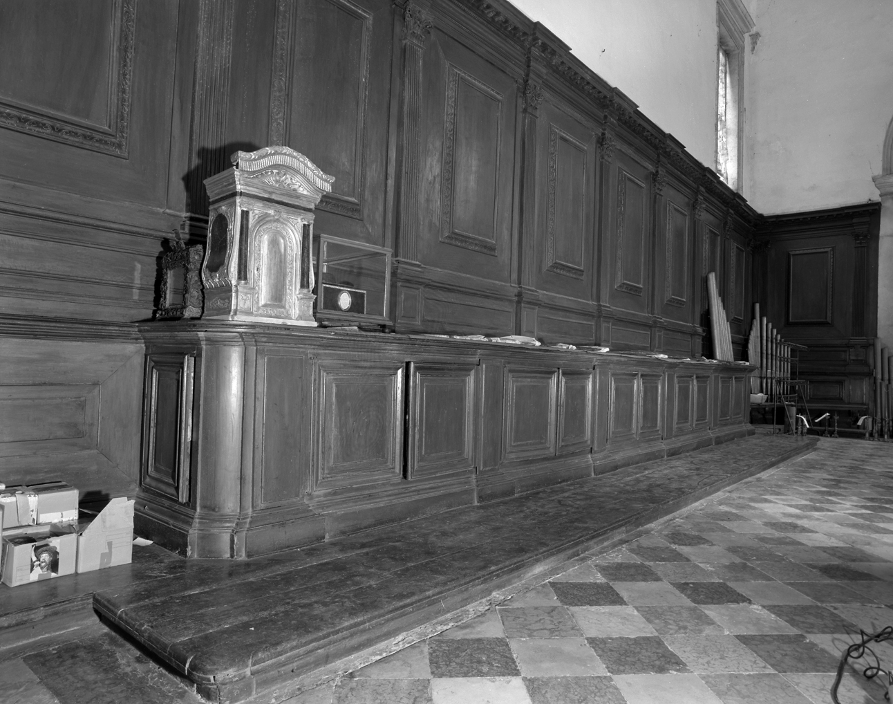 - NOTIZIE STORICO CRITICHE I mobili sono da identificarsi con quelli ordinati a Gasparo Gatti, co-autore del Coro ligneo e del leggio corale posti nell'abside della chiesa. Secondo un documento del "Libro Fabbrica della ch iesa" conservato all'A.S.V. (B. n.21, pr n.10 a, c.10-11) "15 93. Adì16 Marzo in Venetia...R. P. Don Michele Veneto Abate...et il P. D. Gierolimo di Valtelina Cellerario... sono convenuti e stati d'accordo con M. Gasparo ...Gatti...da far tutti li banchi, spalliere, sedoline armeriche vanno intorno la Sacristia..pagargli ducati 900...obli- gandosi...di dar finita essa Sacristia ...per Maggio 1594.."