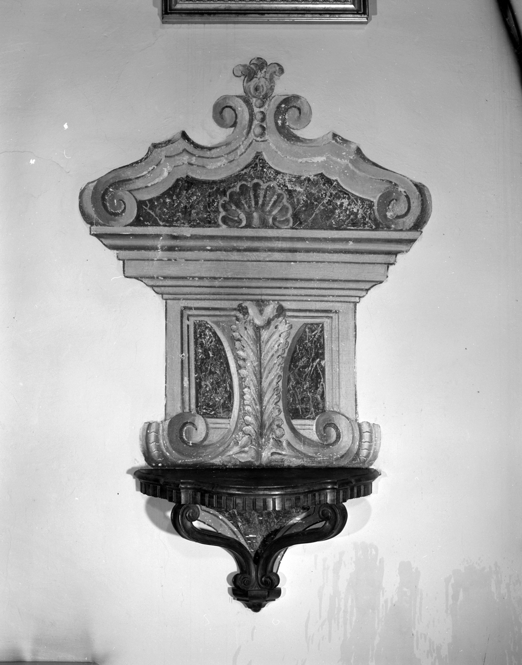 Mensola a muro con due zampe a voluta e piano d'appoggio modanato. Decorazione ad affresco grigio e verde con volute, modanature e conchiglia a motivo architettonico come sfondo