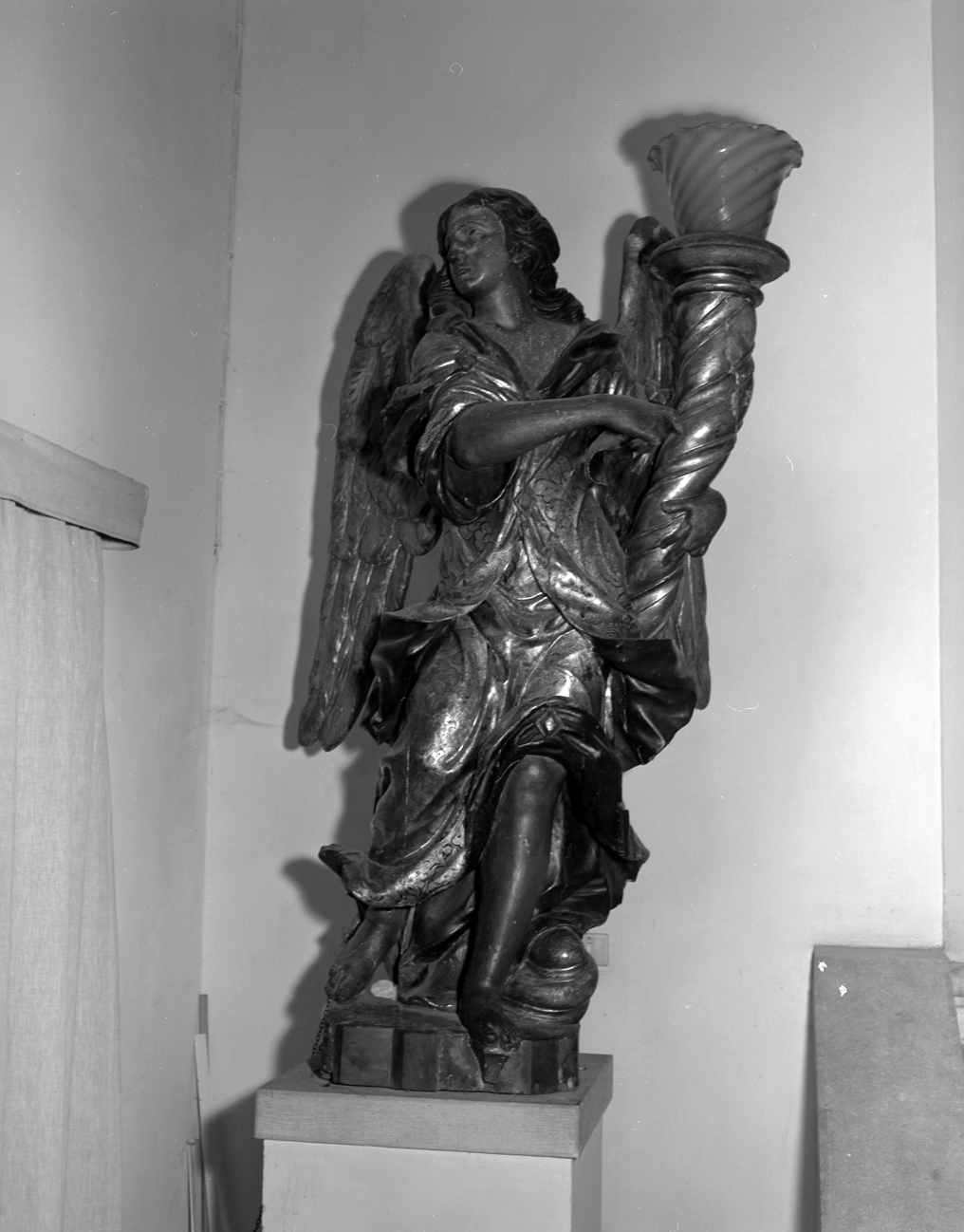 Statua a figura intera in legno dorato e dipinto poggiante su piedistallo di forma irregolare. Personaggi: Angelo. L'angelo poggia su una base di forma quadrata ma irregolare ed è ritratto a figura intera, con le ali, la veste dorata e decorata con motivi oramentali, il volto da giovane girato verso la sua destra. Regge con la mano sinistra una torcia, quasi una cornucopia, adattata per la luce. La gamba destra è arretrata ripetto alla sinistra. I piedi sono scalzi