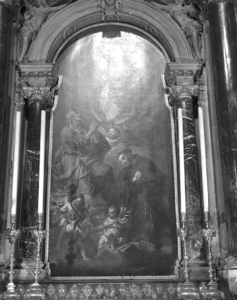 In alto domina la figura della Madonna avvolta in un ampio manto turchino. In basso a sinistra si trova S. Giuseppe inginocchiato con le mani giunte mentre, circondato da cherubini, rivolge lo sguardo verso l'alto. A destra più in basso S. Antonio da Padova, con il saio scuro, prega umilmente con il rosario tra le mani rivolgendo lo sguardo verso il basso, dove compaiono i suoi attributi tipici, un libro e i puttini alati, in questo caso quattro di cui uno con giglio