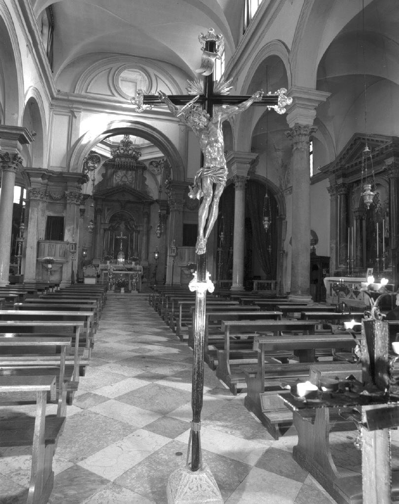 - NOTIZIE STORICO CRITICHE Sia il Cristo, con tipico panneggio svolazzante che la croce con ricche terminazioni dorate e titolo ondulato, sembrano appartenere allo stesso periodo, cioè all'inizio del Settecento. La datazione sembra confermata dalle notizie ricavate da un dettagliato inventario del 1739, dove viene menzionata un'altra croce simile, forse quella ora collocata sull'altare della sacrestia