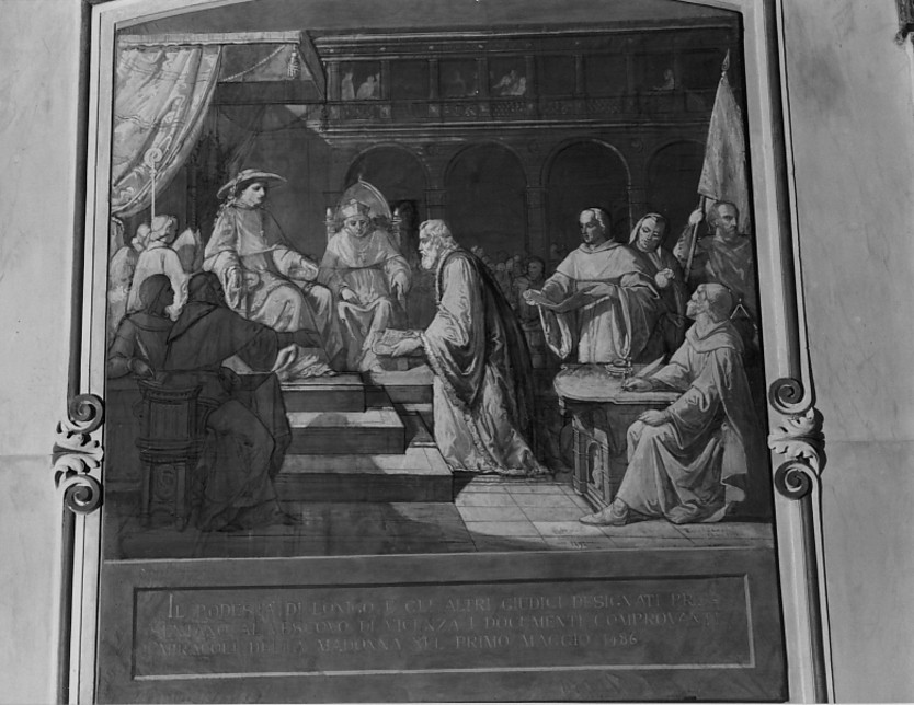 - ISCRIZIONI Fascia sotto il dipinto - IL PODESTA' DI LONIGO E GLI ALTRI GIUDICI DESIGNATI PRE=/SENTANO AL VESCOVO DI VICENZA I DOCUMENTI COMPROVANTI/ I MIRACOLI DELLA MADONNA NLE PRIMO MAGGIO 1486 - corsivo - a pennello - italiano volgare