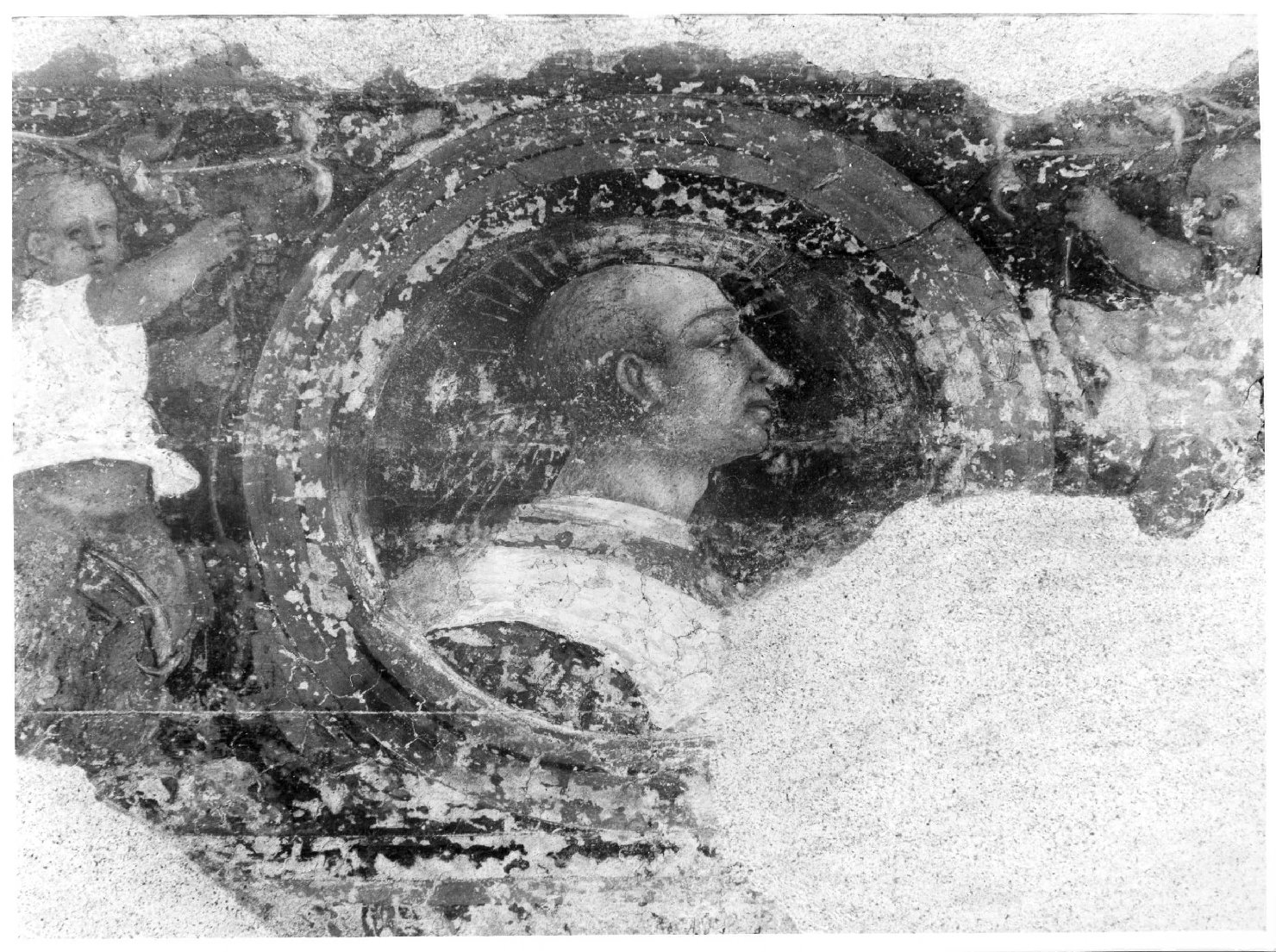 Busto di monaco in clipeo e putti reggiclipeo