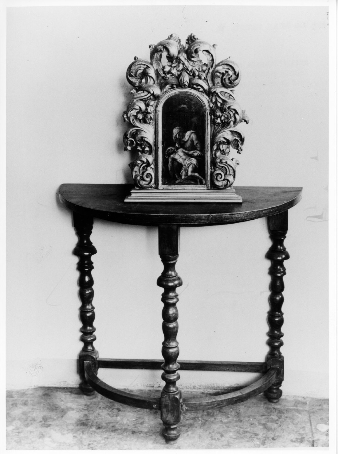 Base: a piedistallo modanato. Cornice: motivi decorativi a volute ve getali con fiori
