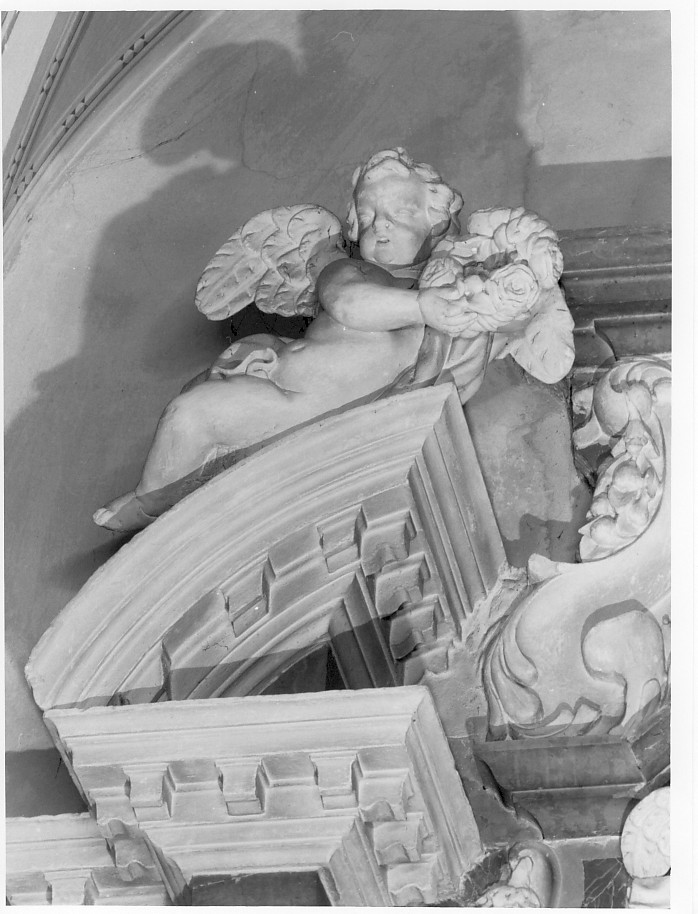 Scultura di angioletto con in mano una ghirlanda di fiori