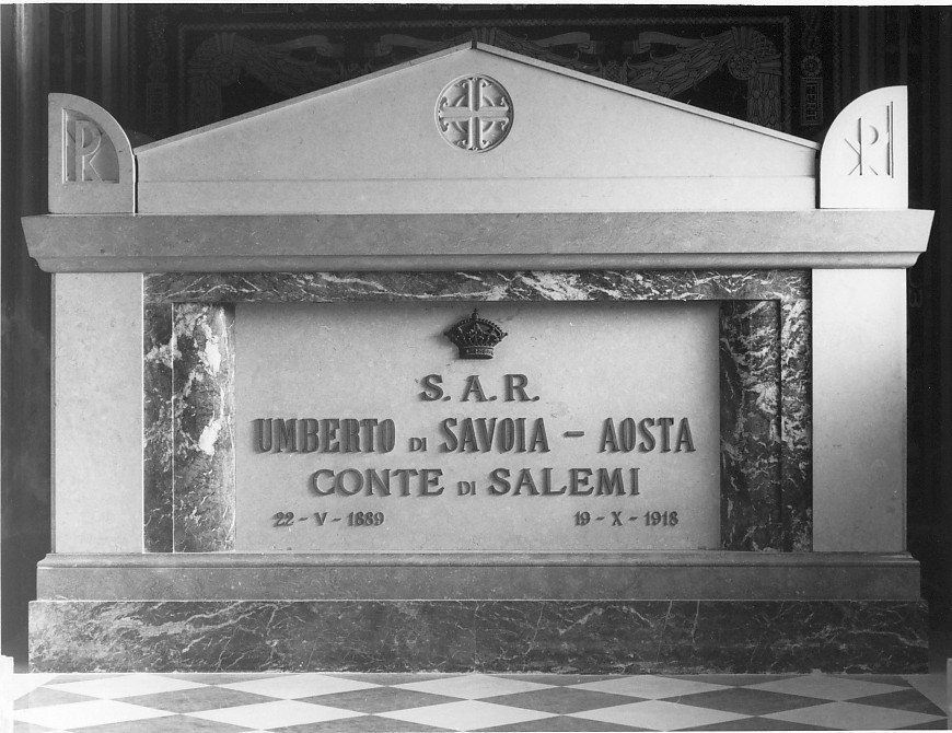 - NOTIZIE STORICO CRITICHE Il sarcofago conserva la salma del conte di Salemi Umberto di Savoia-Aosta, già decorato di due medaglie d'oro al valore militare, morto il 19 ottobre 1918 a Crespano del Grappa d'influenza "spagnola"