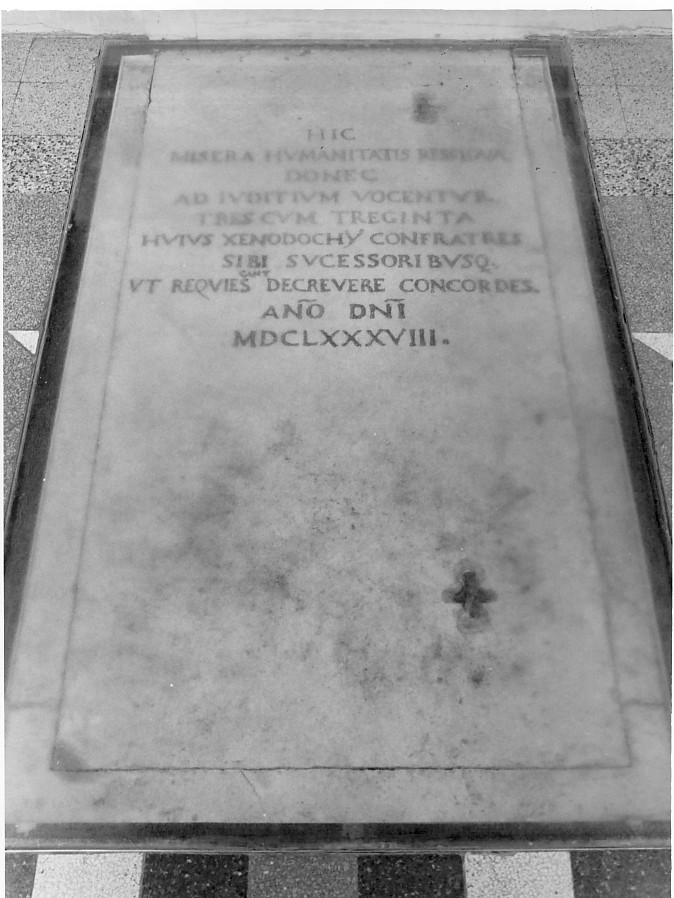 - ISCRIZIONI sulla lapide - HIC/ MISERA HVMANITATIS R[...]A/ DONEC/ AD/ IVDITIVM VOCENTVR/ TRES CVM TREGINTA/ HVIVS XENODOCHY CONFRATRES/ SIBI SVCCESSORIBVSQ./ VT REQUIEScant/ DECREVERE CONCORDES./ ANO DNI/ MDCLXXXVIII - lettere capitali -