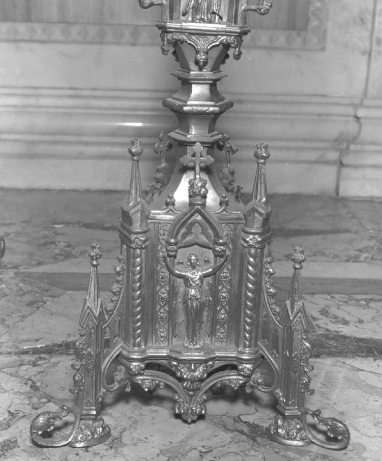A sezione triangolare; ogni piedino, decorato con motivo a voluta, si sviluppa in un elemento architettonico a guglia. Su ogni faccia un angelo a rilievo regge un archetto acuto