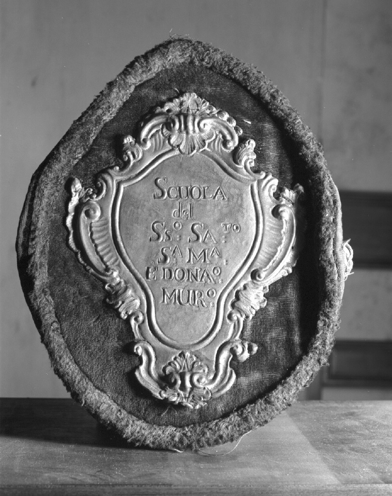 - ISCRIZIONI sul verso dell'insegna - SCUOLA/ DEL/ SS.O SA.TO/ S.A M.A/ E DONA.O/ MUR.O - lettere capitali -