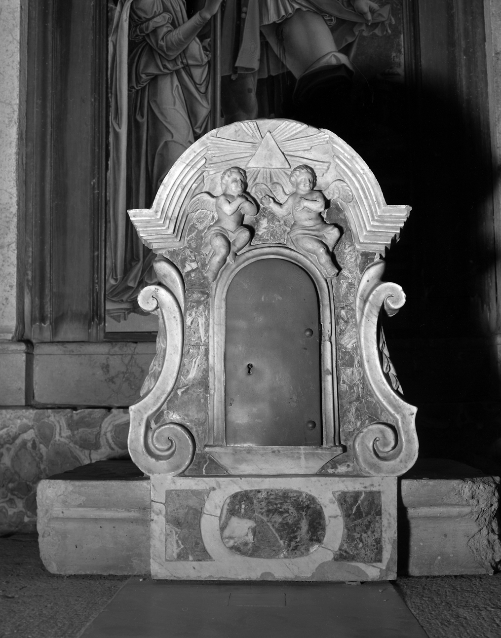 Tabernacolo a frontale architettonico. Decorazione: volute; arco centinato; triangolo raggiato; angioletti