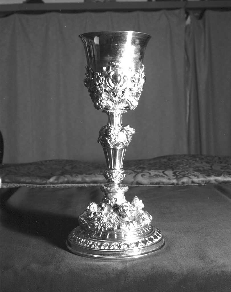 Piede circolare; nodo a vaso; sottocoppa a motivi vegetali; decorazione: fogliette; volute fogliacee; fiori; quattro medaglioni con teste di Santi a tuttotondo; testine alate sul nodo