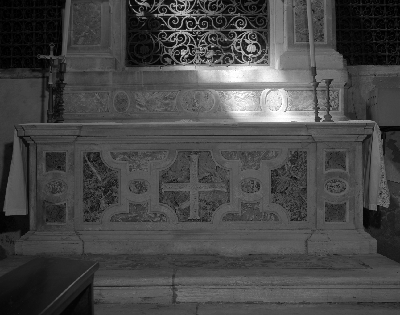 La mensa si presenta con marmi venati inframmezzati da marmi bianchi con due motivi trilobati, speculari, in cui si inserisce nel mezzo un ovulo. Al centro vi è una croce greca decorata in una cornice ottagonale