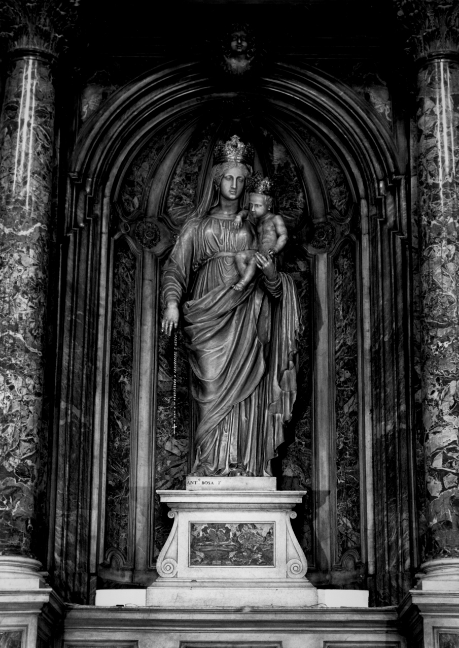 - NOTIZIE STORICO CRITICHE La presente statua della Madonna del Rosario fu commissionata ad Antonio Bosa, parrocchiano e professore all'Accademia, dai fabbriccieri poichè si voleva sostituire il trono, o caregon, in legno policromo fatto appositamente nel 1734 dall'Arrigoni, detto Sega, per essere collocato nella nicchia e per accogliere l'immagine della Madonna del Rosario, del tipo Madonna vestita (Niero, 1979, p.55, 106). Il Bosa è uno scultore neoclassico di rigida fedeltà canoviana