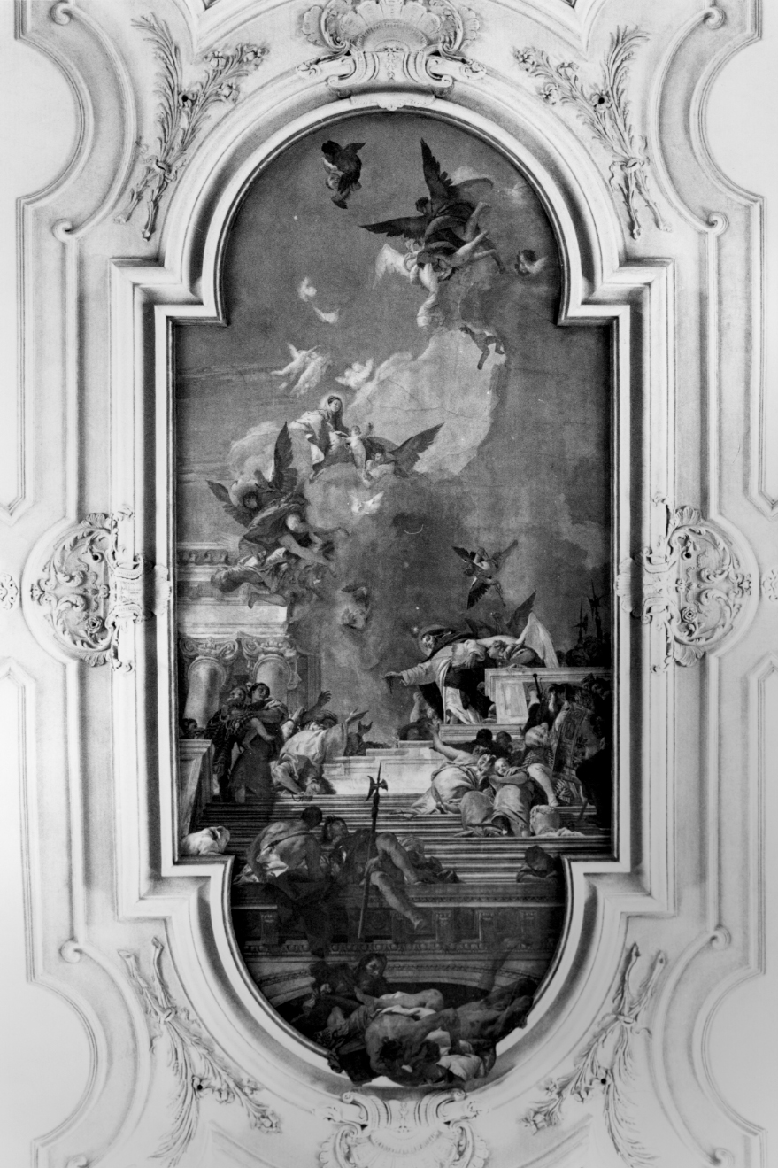 - NOTIZIE STORICO CRITICHE L'affresco centrale costituisce il capolavoro assoluto del Tiepolo nella chiesa. Era inusuale per lui, e continuò ad esserlo, fare uso di una composizione architettonica così preminente. In particolare il trucco della rampa di gradini in primo piano è frutto di una rilettura dell'opera del Veronese al quale erano cari i motivi della balaustra fortemente prospettica e l'angolo dell'edificio proiettato contro il cielo. I bozzetti relativi a questo scomparto sono a Milano, Collezione Crespi, e a Berlino, museo (Pracerutti-G., 1971, p.81)