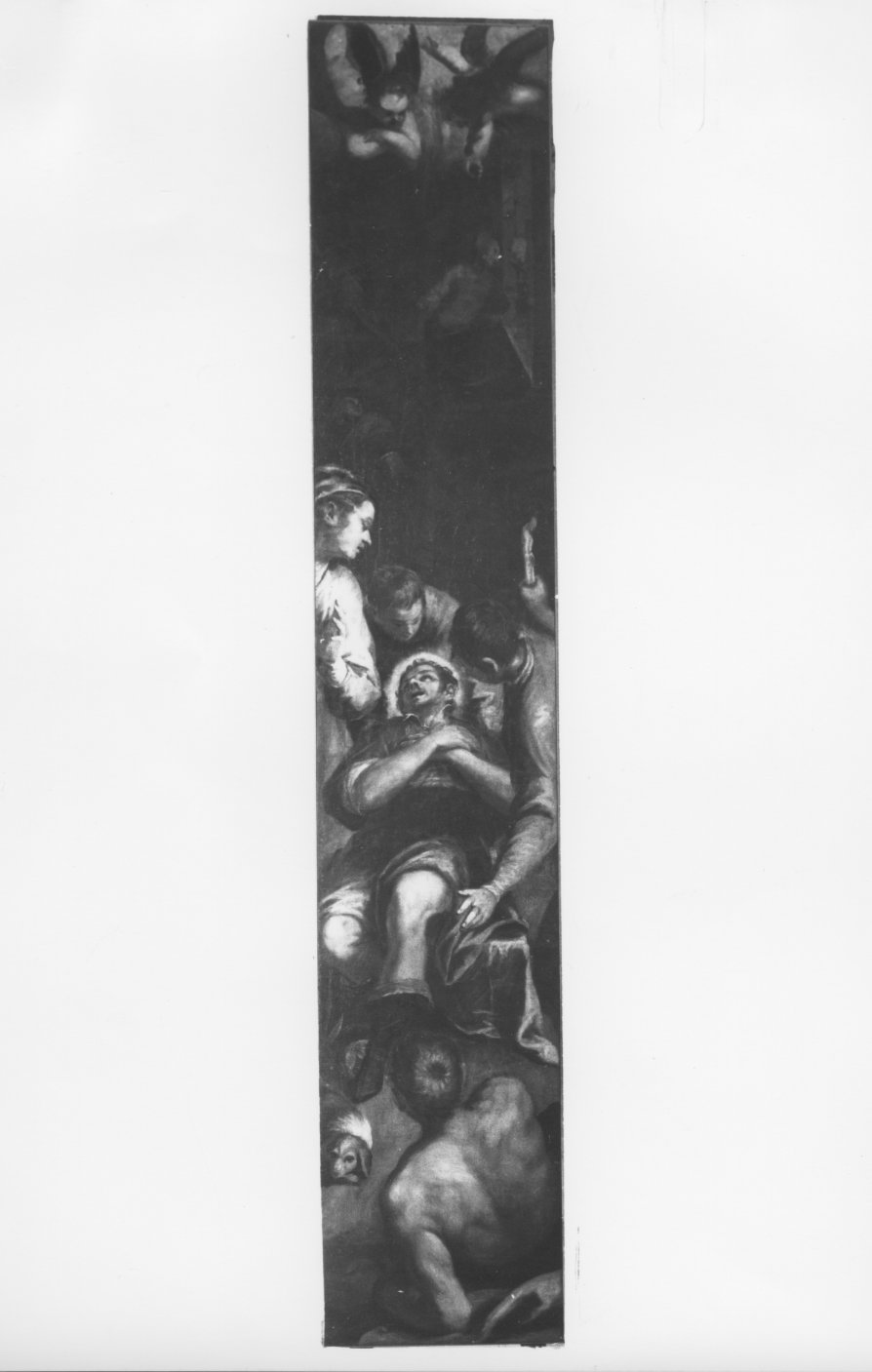 - NOTIZIE STORICO CRITICHE Menzionato a partire dallo Stringa (1604), assieme all'altro dipinto del Peranda che gli sta a fianco, venne commissionato dalla scuola di S. Rocco che si riuniva in chiesa nel primo altare a sinistra. Nel libro di Cassa di detta Scuola, reperito dalla Mason Rinaldi (1979), sono infatti registrate le spese sostenute per entrambe le tele alla data 16 agosto
