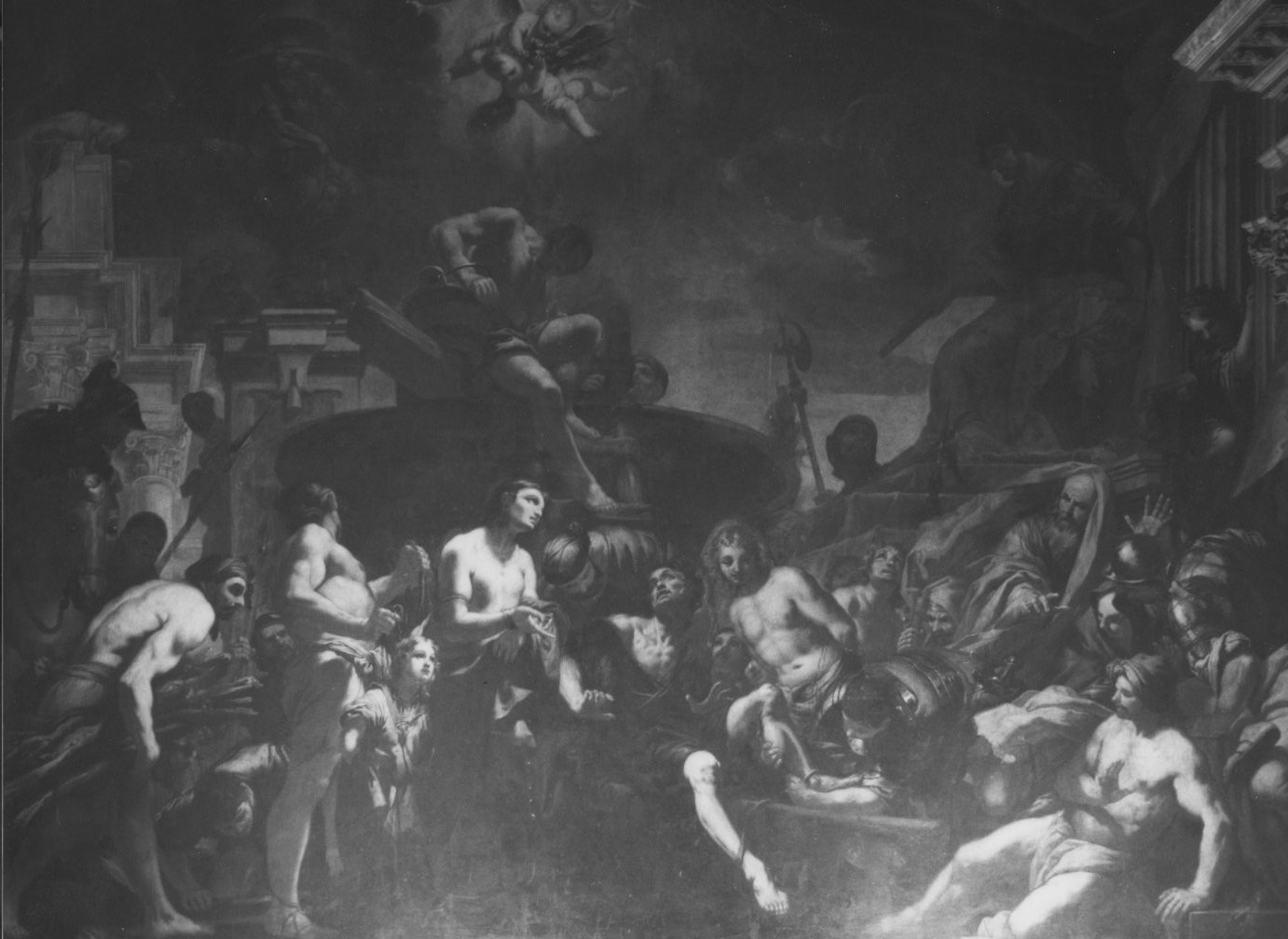 - NOTIZIE STORICO CRITICHE Il primo a informarci della sua lavorazione presso lo studio dello Zanchi è il Boschin (1674) che ci permette di collocarlo cronologicamente tra le opere eseguite intorno al 1674. Si può infatti accostare al "Giudizio Universale", eseguito per la sala dell'Albergo Nuovo della Scuola Grande di S. Fantin e Girolamo, datato intorno a tale anno. Grazie alle vicende della vita di S. Giuliano di Antiochia, è possibile ricostruire l'episodio ed identificare il giovinetto in Celso: figlio del tiranno Marciano che, convertitosi venne gettato in prigione (Grandis D., 1761, pag. 288 e sgg.)