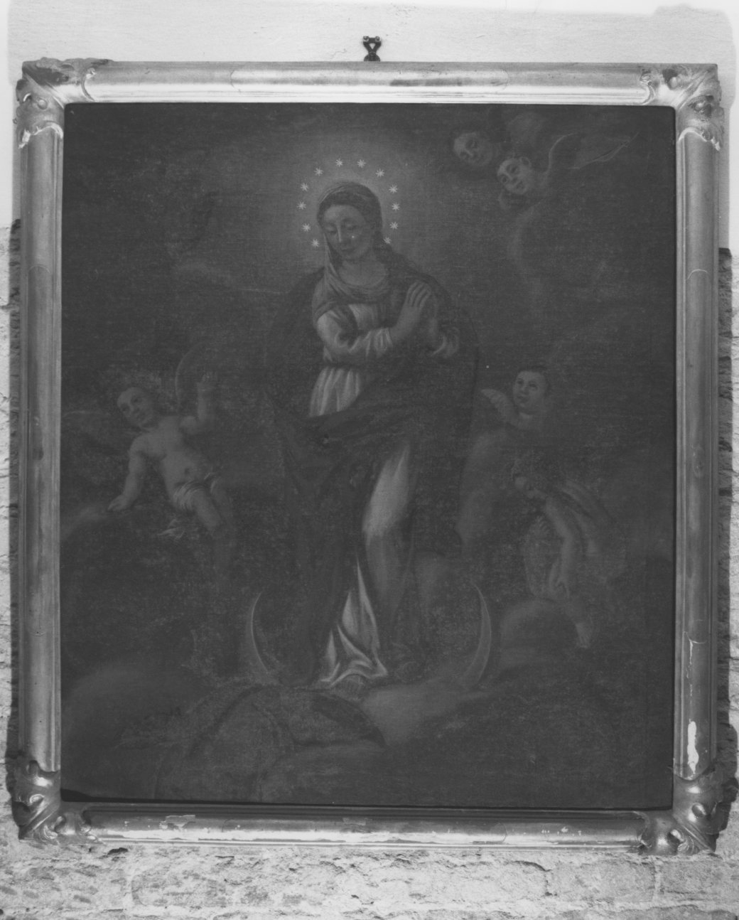 La Vergine, raffigurata secondo l'iconografia dell'Immacolata Concezione - coronata di stelle, poggiante sulla luna e con il serpente ai suoi piedi -, tiene le mani giunte sollevate davanti al petto e lo sguardo rivolto verso il basso; è attorniata da alcuni angioletti in volo tra le nubi
