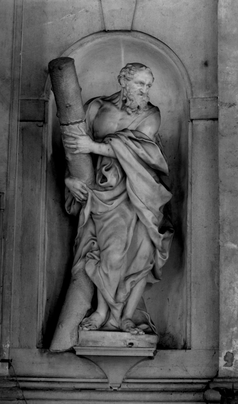 Scultura a tutto tondo su piedestallo entro nicchia. Santo con croce decussata dietro le spalle, sorretta verso destra da entrambe le mani; abito lungo; sguardo volto a sinistra
