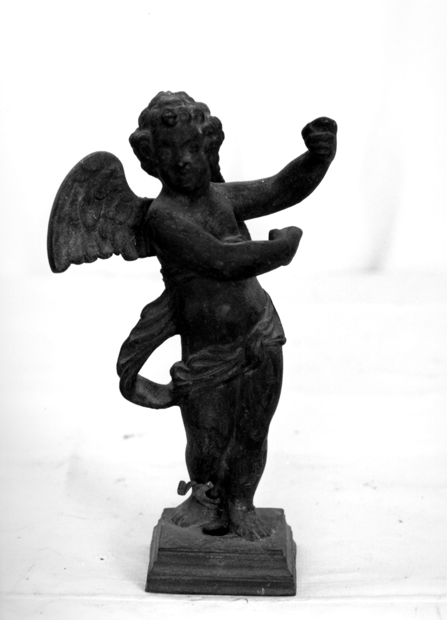 Statuetta su piedistallo quadrato. Angioletto rappresentato a figura intera con le braccia alzate verso destra e le mani chiuse a pugno. Abbigliamento: drappo svolazzante