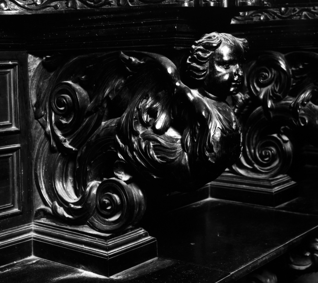 Busto femminile con tronco a forma di pesce terminante in voluta. Testa di putto leggermente rivolta alla propria destra. Capelli raccolti dietro la nuca. Due ali terminanti in foglie