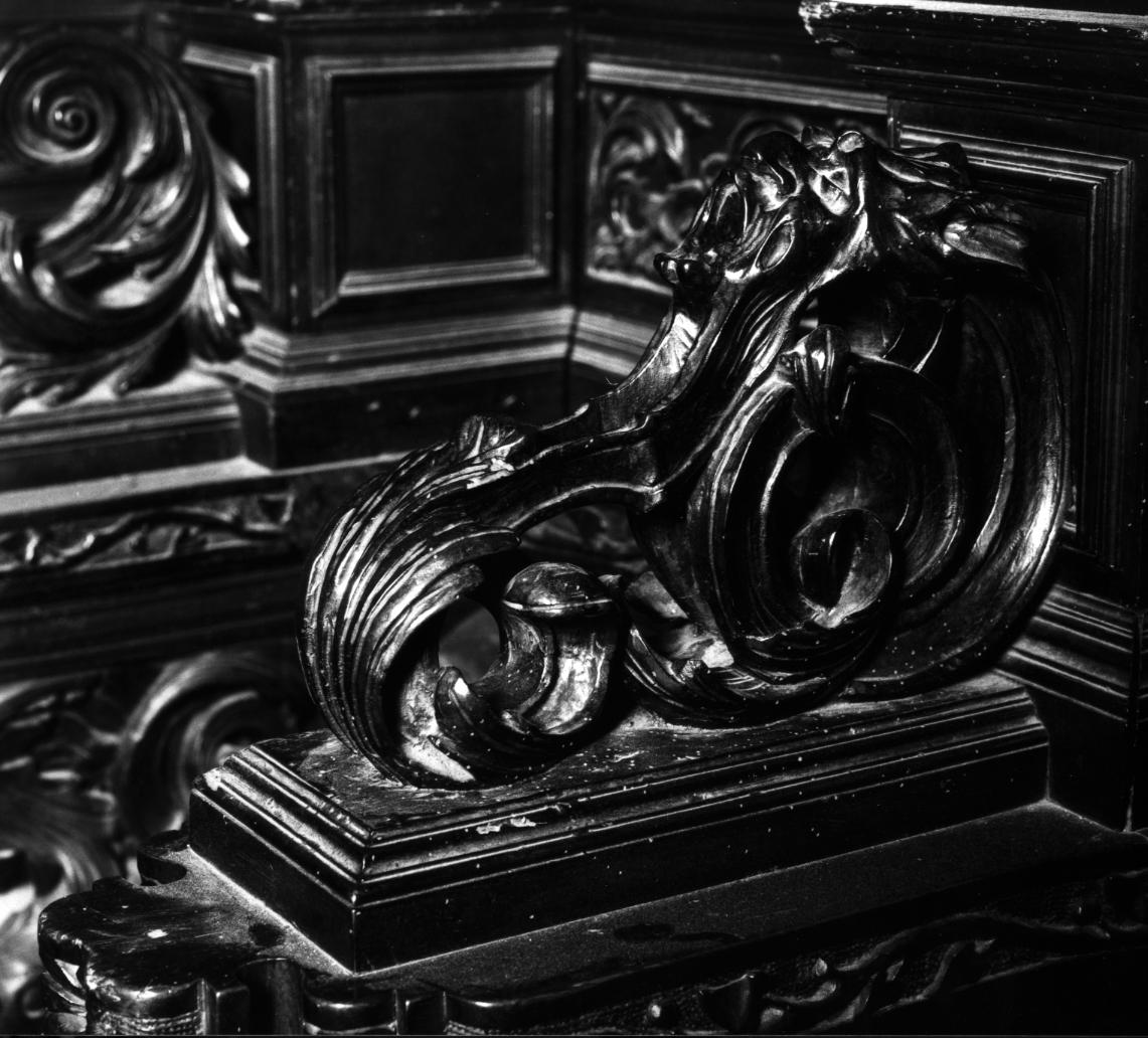 Due grandi volute con decorazioni geometriche e vegetali. Sopra la voluta maggiore è scolpito ad alto rilievo un mascherone
