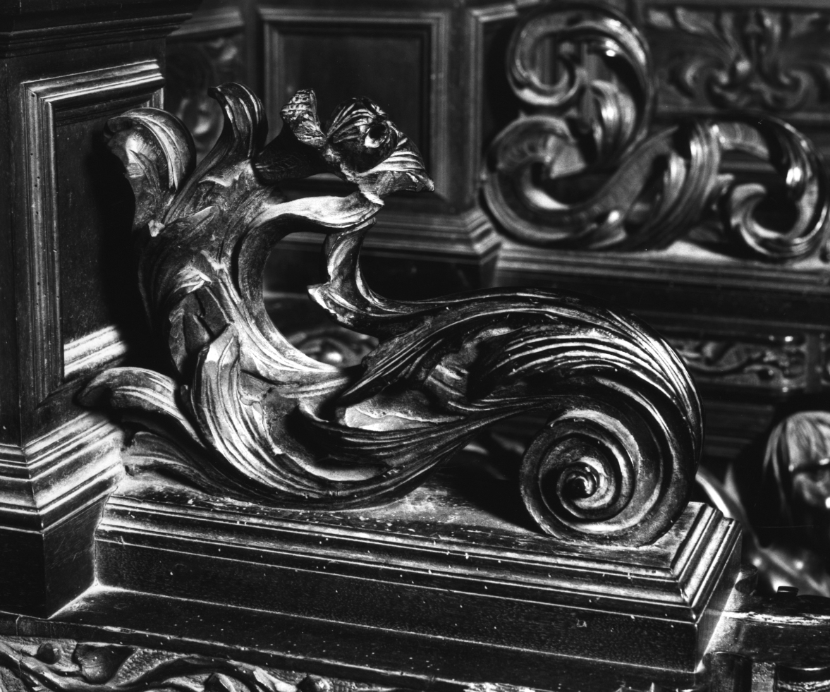 Due volute una maggiore a motivi vegetali ed una minore a motivi geometrici. Tra le due volute un fiore a tutto tondo