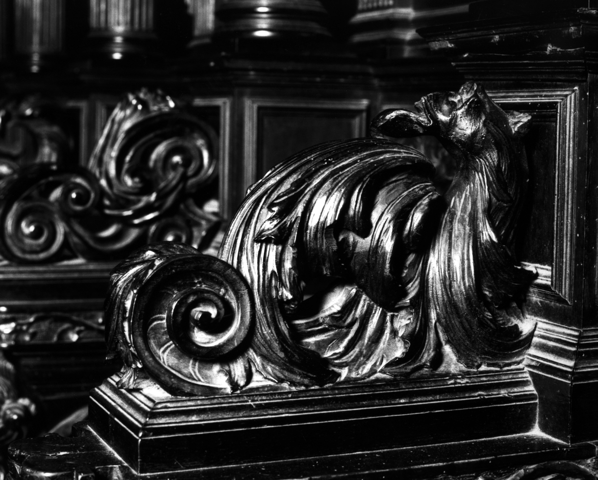 Due grandi volute con decorazioni geometriche e vegetali. Sopra la voluta maggiore è scolpita una testa di drago
