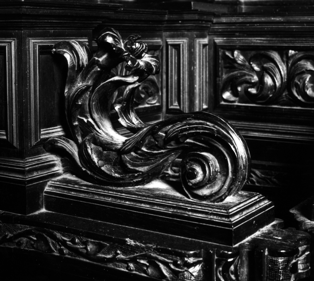 Due volute una maggiore a motivi vegetali ed una minore a motivi geometrici. Fiore a tutto tondo tra le due volute